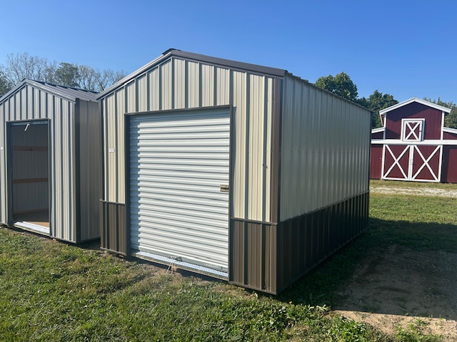 Maximize your storage with this 10×14 Standard Metal Utility Shed, designed for strength, style, and efficiency. The 6′ wide roll-up door offers smooth, easy access for lawn equipment, tools, or outdoor gear, while the attractive wainscot siding adds a clean, modern look.