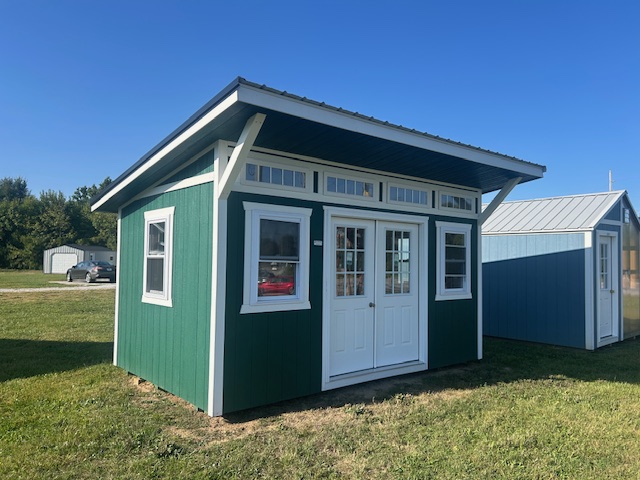 Create your perfect workspace with the 10′ x 16′ Classic Studio, designed for comfort and natural light. This stylish studio features prehung double doors with glass panels for an inviting entrance, along with four insulated double-hung vinyl windows and four vinyl transom windows with grids, flooding the space with bright, even light. The one-way roof and generous roof overhangs (1′ on three sides and 3′ on the front) provide protection from the elements while adding architectural charm. Whether for art, office, or hobby space, this studio combines function and style beautifully.