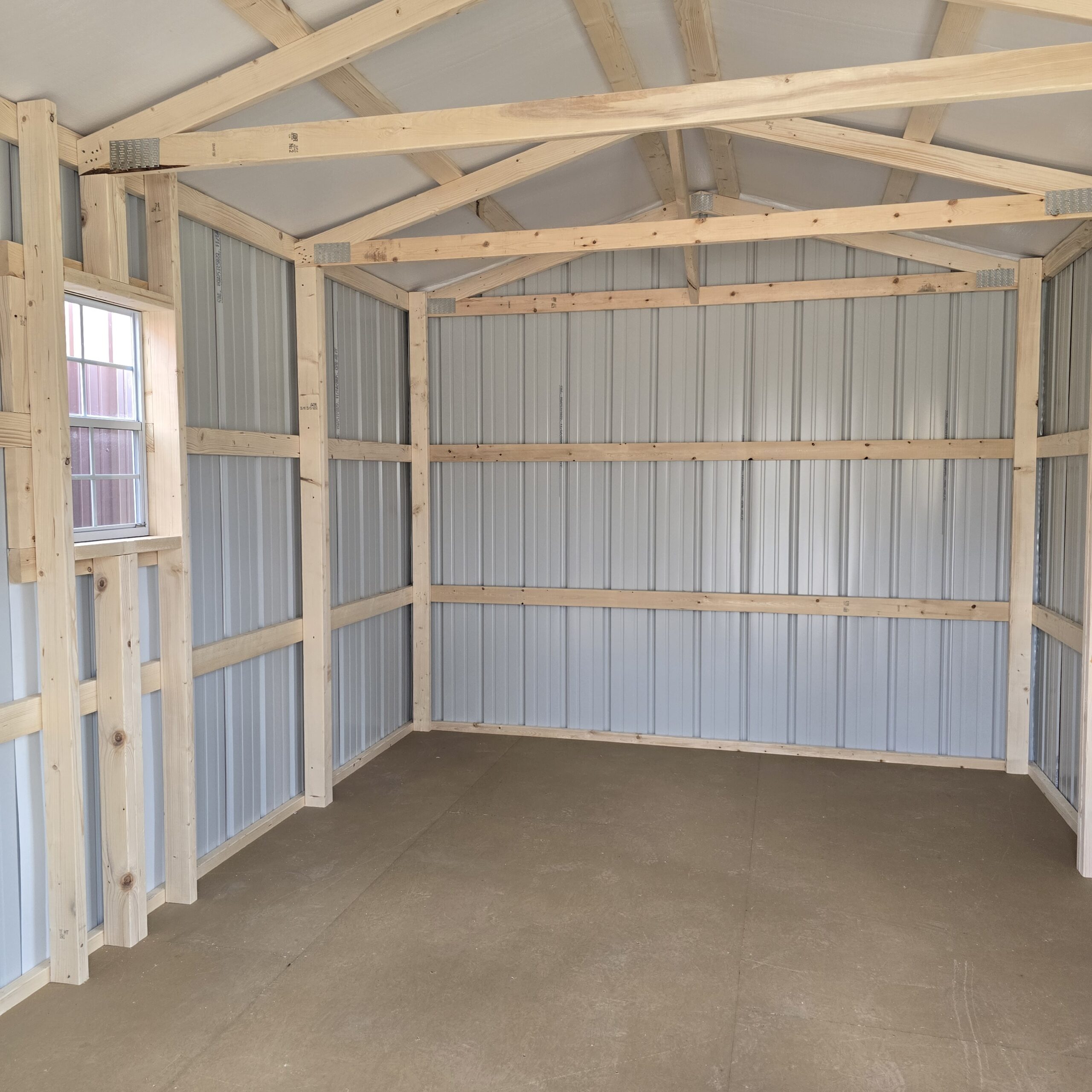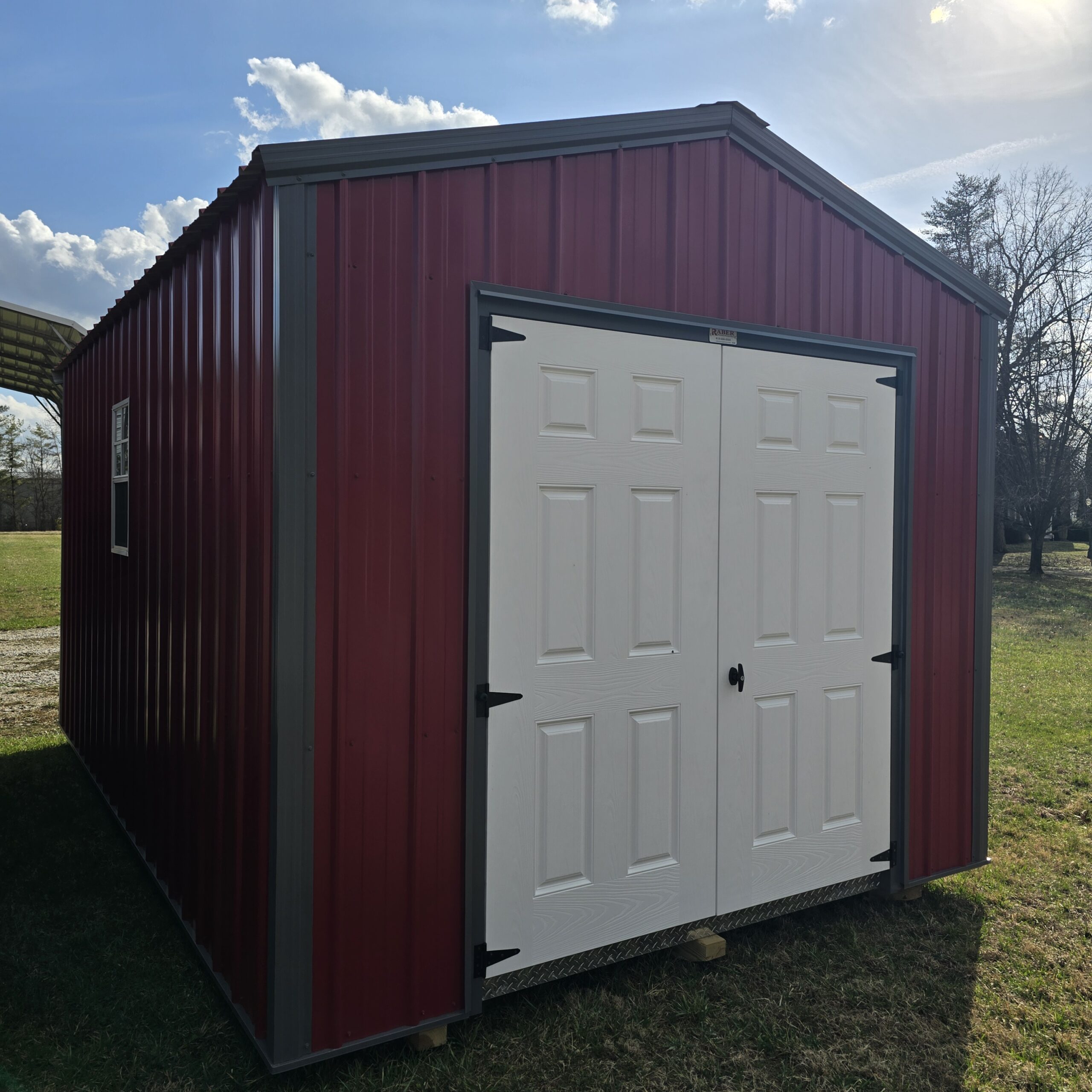 Our 10×16 Standard Metal Shed provides durable, low-maintenance storage with plenty of space for tools, equipment, and outdoor gear. It features double fiberglass doors for easy access and two 18×27 windows that bring in natural light while you work or organize. Built with strong metal construction, this shed is a reliable and practical addition to any property.