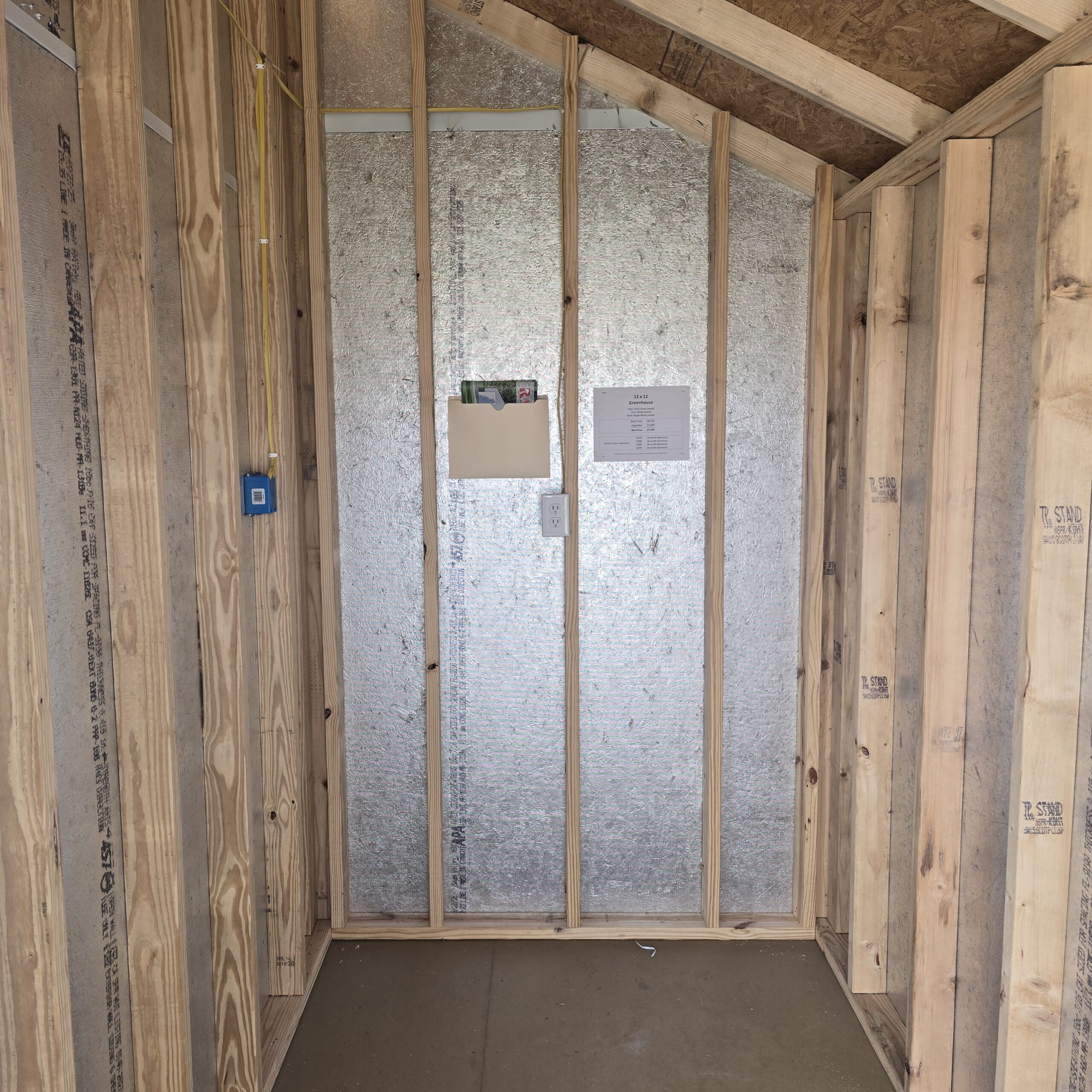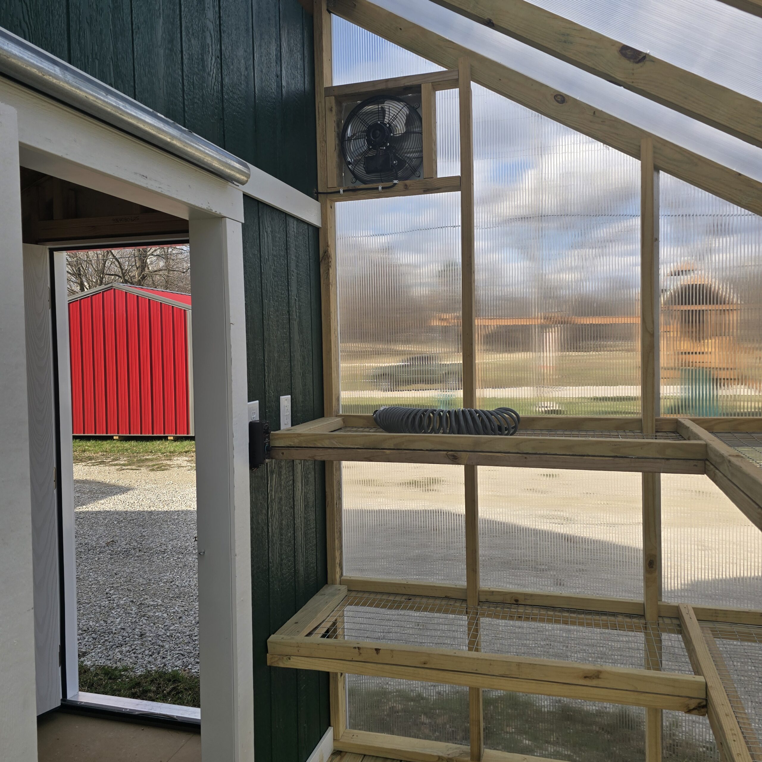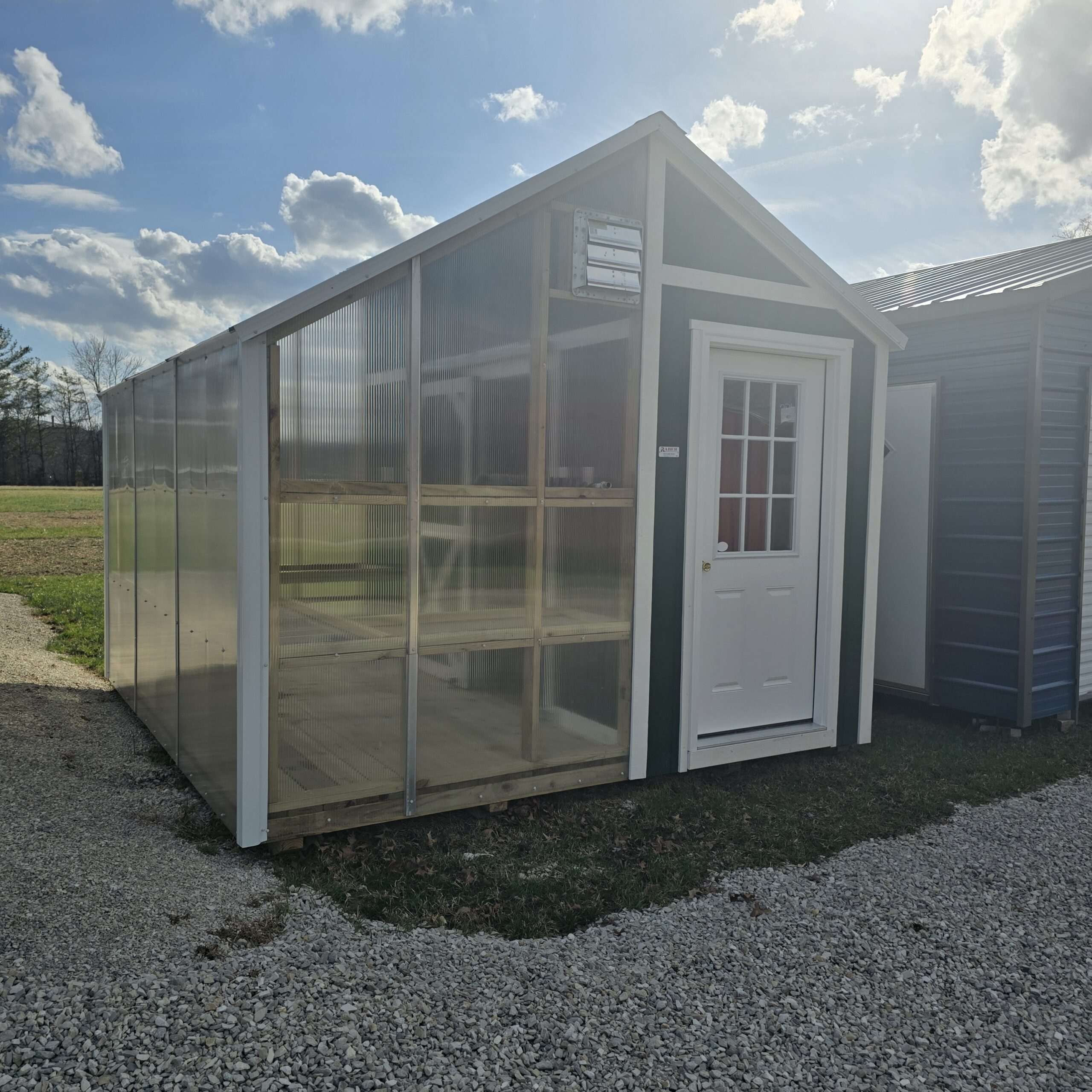 Our 12×12 Greenhouse is the perfect space for growing plants, starting seedlings, and extending your gardening season. Built with insulated polycarbonate clear panels on the roof and sides, it allows plenty of natural sunlight while maintaining durability. It features a 36" prehung entry door with glass (in-swing), 2' plant shelves, and a treated deck board floor in the greenhouse area. A gable vent, garden hose hookup, and greenhouse electric package provide the airflow, watering access, and power needed to keep your plants thriving year-round.
